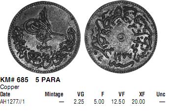 QUOTE(ivan ivanov @ Jun 28 2012, 12:58) Вот попалась монетка ,может кто подскажет что и откуда ? Что - 5 или 10 пара (на Вашем фото пальцы лучше монеты видны + монета в плохом сохране). Откуда - Турция. Когда - начало 1860-х годов. На картинке - фрагмент из Краузе. Вложенные эскизы изображений -------------------- Специализация: джучидские данги от Тюляка до Ибака.