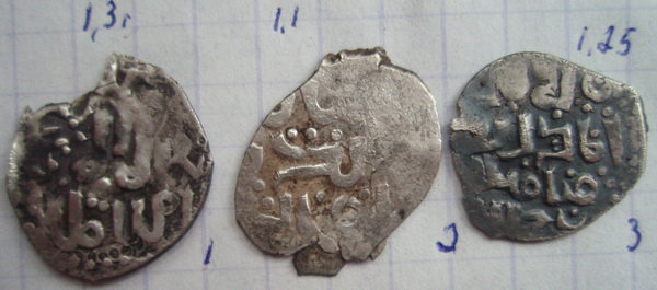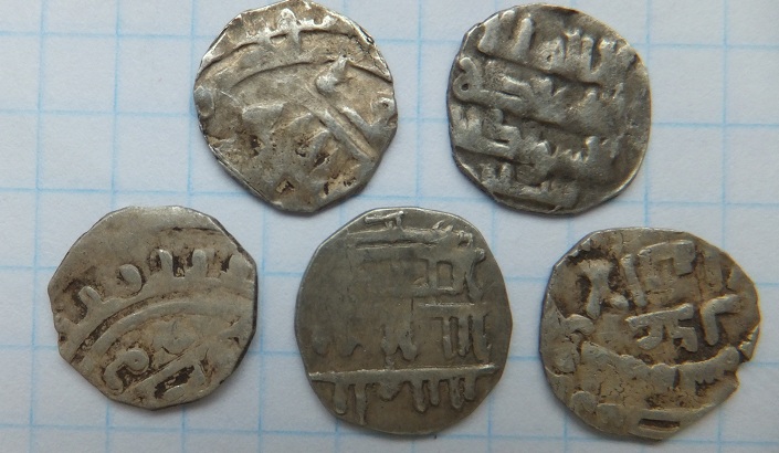 1. Узбек, Булгар ал-Махруса, 723 г.х. 2. Узбек, Булгар ал-Махруса, 731 г.х. 3. Анонимный дирхем Булгара 13 в. с легендой:" султан справедливый". 4. Анэпигрфный дирхем Булгара 13в. 5. Анэпигрфный дирхем Булгара 13в. "заяц" -------------------- Таможня дает добро!