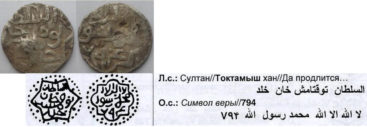 QUOTE(toreft @ Dec 22 2012, 13:07) "...2 - Токтамыш, Сарай (?), 794 Г.Х. ..." № 2. Тохтамыш. Без указания места чекана. С символом веры. 794 г.х. |