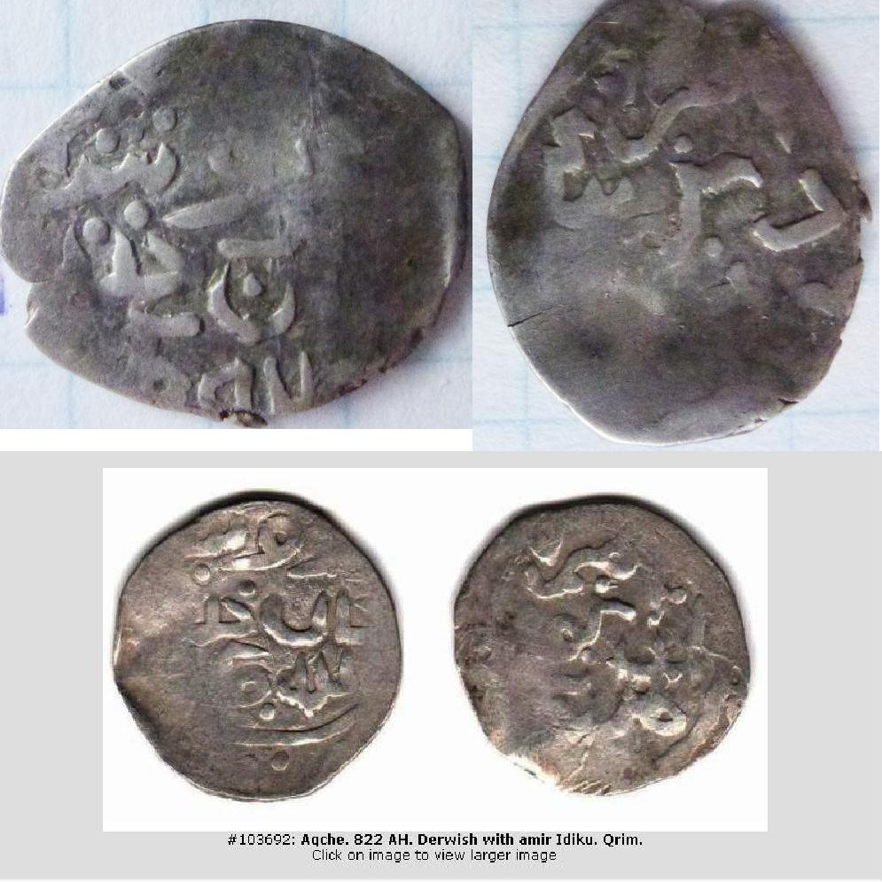 уже давно задал другой вопрос: почему для чтения, приведшего к появлению убойно популярного в джучидской нумизматике эмира Едигея, пришлось выкинуть из легенды пяток букв. http://rasmircoins.ucoz.ru/forum/18-7138-1 Там, правда, тоже нет ответа, что в действительности написано на оборотке дервишей и бексуфи |