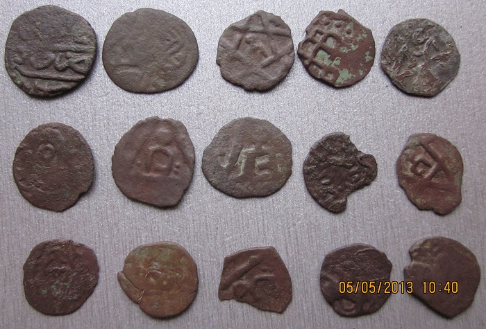 1. Именной пул хана Хызра. Чекан Сарая ал Джадида 762 г.х. 2. Анонимный пул чекана Крыма (744 г.х.) Двухглавый орел. 3,10. Анонимный пул чекана Булгара 734 г.х. "Тамга в звезде". 4. Анонимный пул чекана Булгара. "Булгарская решетка". До 740 г.х. 5,6,7, 13. Анонимный пул чекана Булгара 734 г.х. "Тамга в треугольнике". 8.11. Анонимный пул чекана Сарая ал Джадида. "Двухглавый орел". 14,15. Анонимный пул чекана Сарая. "Лев и солнце". |