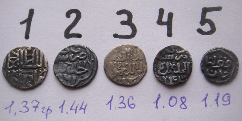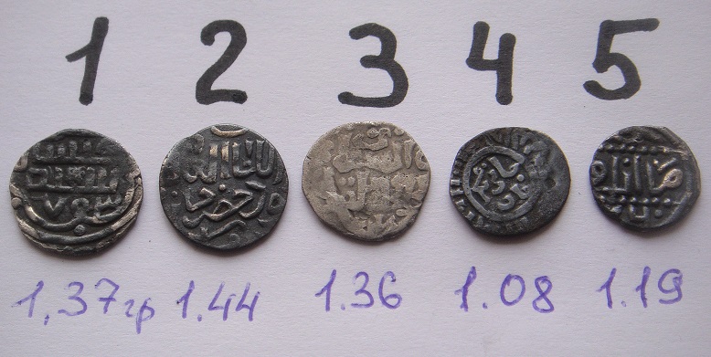 QUOTE(Сергио @ Mar 3 2014, 16:02) 1) Джанибек-хан, чекан Гюлистана, 753 г.х.. 2) Хызр-хан, чекан Сарая ал-джадид, 761 г.х.. 3) Джанибек-хан, чекан Сарая ал-Джадид, (745 г.х.). 4) Джанибек-хан, чекан Сарая ал-джадид. 743 г.х.. 5) Кульпа-хан, чекан Азака, 760 г.х.. Практически все рядовые, = 150-200 р, №4 и 5, немного дороже. |