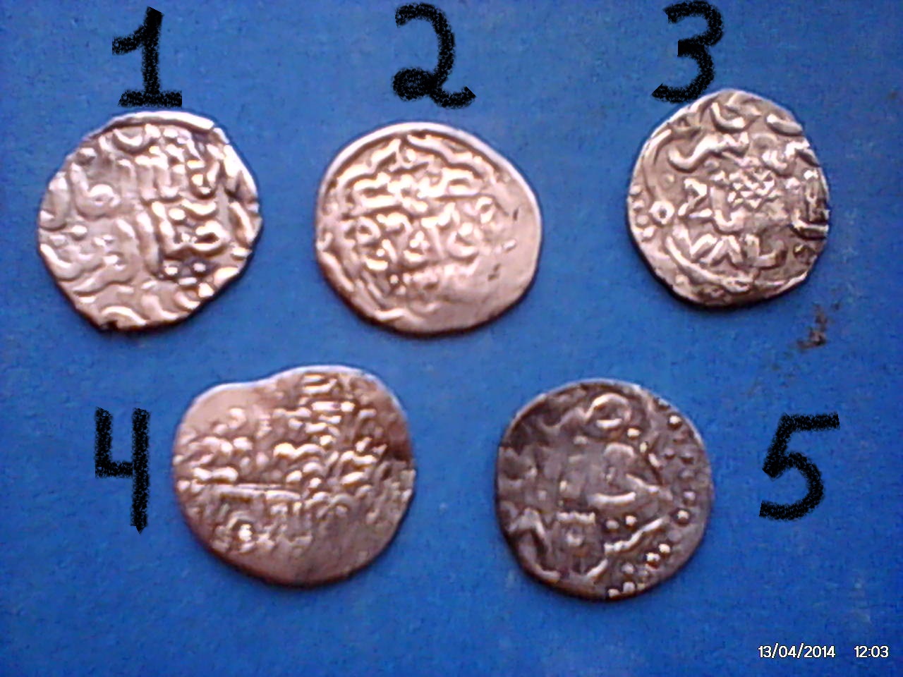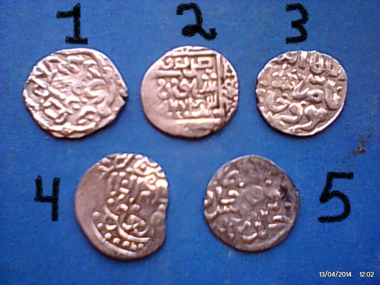 Уважаемые! Просьба определить 5 дирхемов. Информацию по ним и возможную цену. Найдены в 1 ямке в Астраханской обл. Для удобства пронумировал. Заранее благодарю.