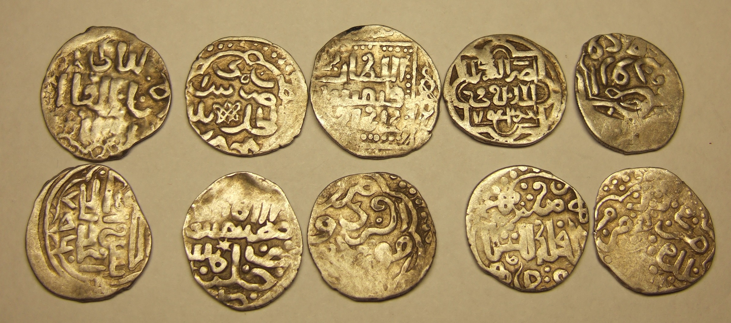 №1 и 2 - Узбек, чекан Сарая, год? №3 - Джанибек, чекан Сарая ал-Джадид, 747 г.х.. №4 - Мухаммад, чекан Орды, год? №5 - Джанибек, чекан Сарая ал-Джадид, 746 г.х.. |