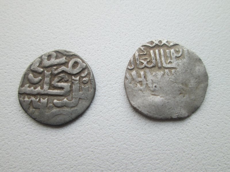1. Только оборотка. Чекан белед Гюлистан 760 г.х. 2. Мухаммад. Чекан Орды 773 г.х. |
