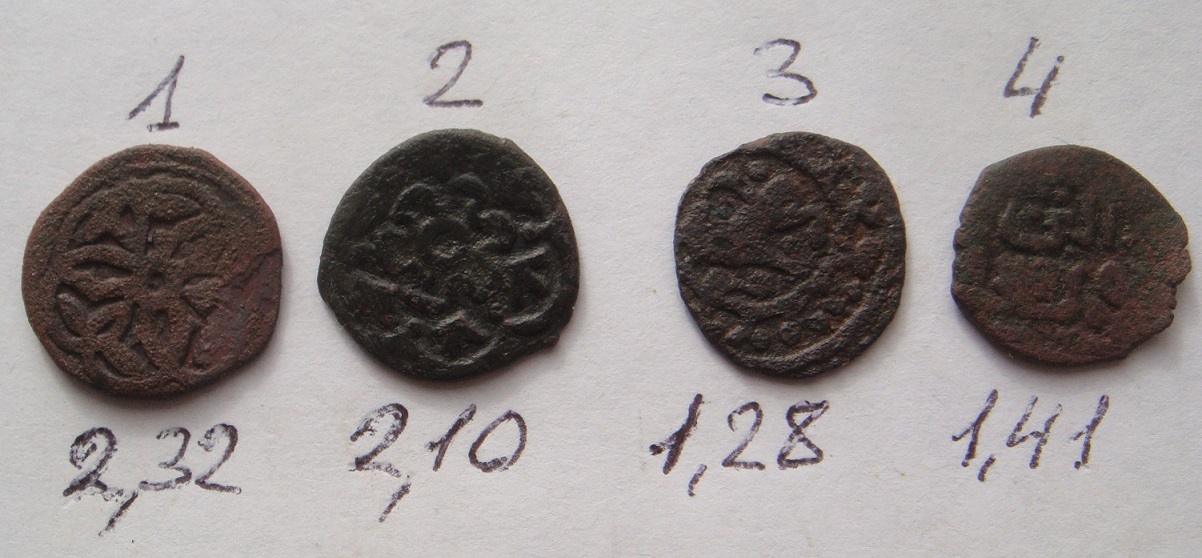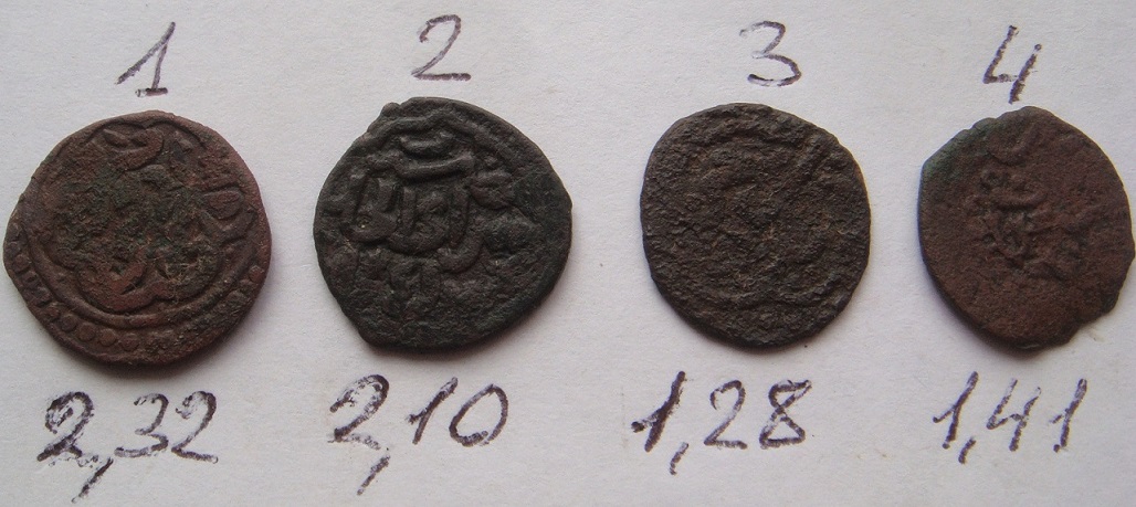 QUOTE(subedei @ Nov 11 2014, 11:19) 1) Анонимный пул, "трилистник", чекан Барджина, 753 г.х.. 2) Анонимный пул, "цветок-розетка", чекан Сарая ал-Джадид, 752-753 гг.х. Сабир , огромное спасибо ! По №3 - предположительно чекан Хаджи Тархан , зверь вправо , помоему я уже такой находил , у тог состояние было получше , вот по № 4 , инфы не нашёл ??? |