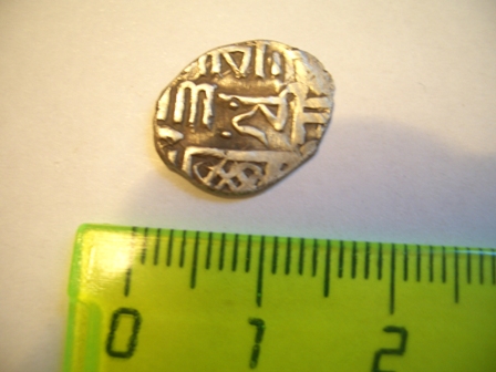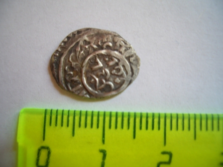 Когда то был хороший дирхем: Джанибек-хан, чекан Саря ал-Джадид, 743 г.х., да вот обрезали его по самое "не хочу"... В таком виде, 250-300 рублей, не более.