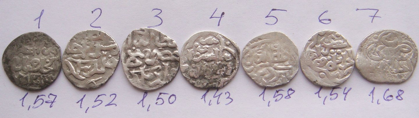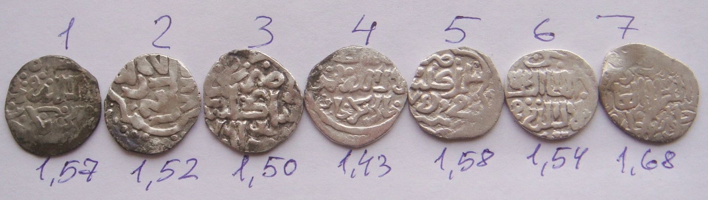 QUOTE(Сергио @ Mar 28 2015, 17:51) 1) Джанибек-хан, чекан Сарая ал-Джадид, 752 г.х.. 2) Мюрид-хан, чекан Гюлистана. 76(?) г.х.. 3) Хызр-хан, чекан Гюлистана, 761 г.х.. 4 и 6) Джанибек-хан, чекан Сарая ал-Джадид, 745 г.х.. 5) Бердибек-хан, чекан Гюлистана, 759 г.х.. 7) Джанибек-хан, чекан Сарая ал-Джадид, 50-тые гг., 14-го в.. |