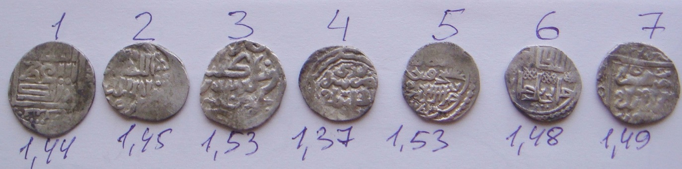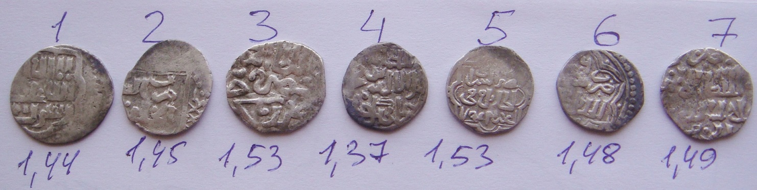 Действительно, примечательные монеты! №1. По стороне с тамгой в треугольнике, от анонимного недатированного пула чекана Сакчи. №2. По стороне с птицей, от анонимного недатированного пула чекана Крыма. Такое сочетание встречается редко. Интересны для изучения организации и технологии чекана на монетных дворах Сакчи и Крыма. |