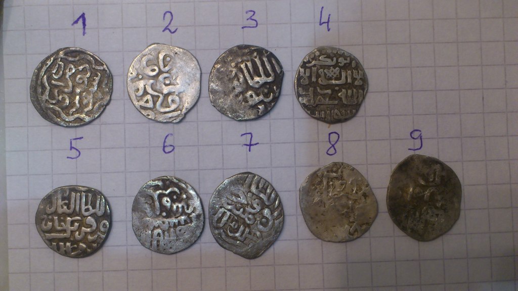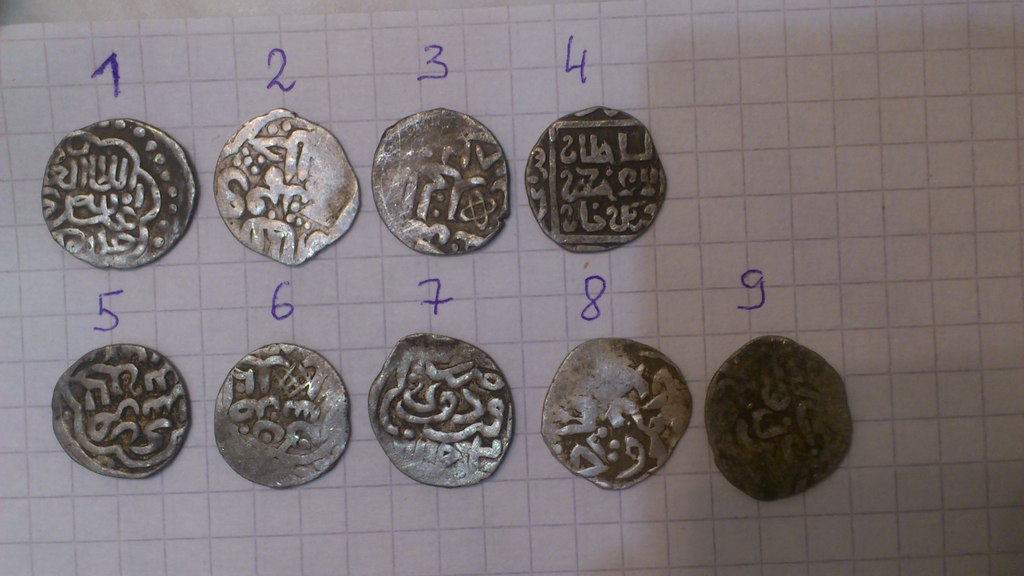 QUOTE(Светломир @ Apr 19 2015, 21:54) Прошу определить и оценить дирхемы - все с одной поляны 1 Джанибек, Сарай ал-Джедида 2,7 Пулад, Хаджи-Тархан 3 Шадибек, Белед Азак 4,5,8,10 Шадибек, Каффа Джедида 6 Шадибек с Символом Веры 9 Шадибек, Урду ал-Джедида |