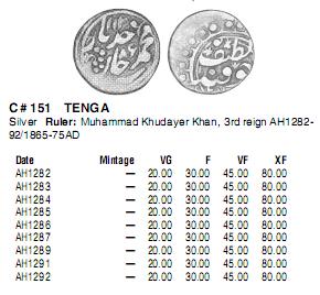 на мой взгляд, монета у Вас интересная, сохранность хорошая: Коканд, таньга 1285/1285. Посмотреть: http://www.zeno.ru/showphoto.php?photo=80792 По цене сказать сложно (что в подписи и написал). Во вложении - фрагмент из Краузе. Вложенные эскизы изображений -------------------- Специализация: джучидские данги от Тюляка до Ибака.