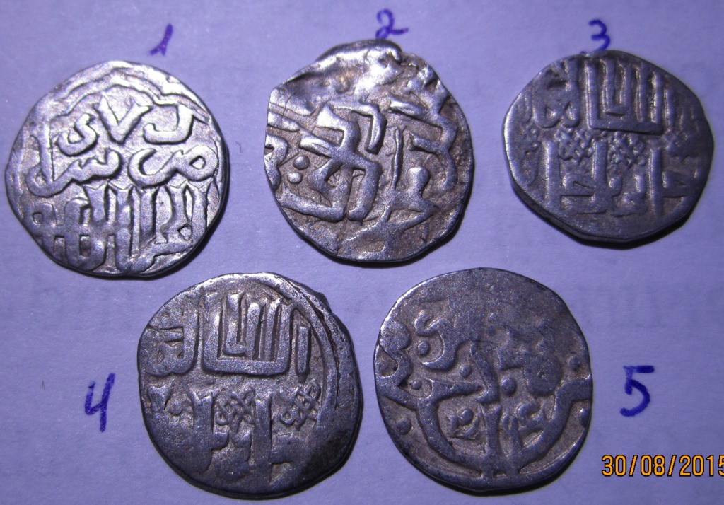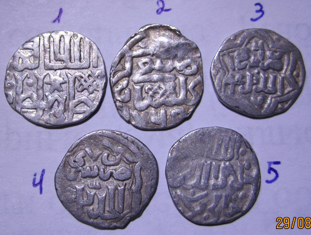 QUOTE(MDP @ Aug 30 2015, 02:58) Уважаемые знатоки, прошу определить и оценить монеты. 1 и 4) Джанибек-хан, чекан Сарая ал-Джадид, 747 г.х.. 2) Мюрид-хан, чекан Гюлистана, 60-тые гг., 14-го в.. 3) Джанибек-хан, чекан Сарая ал-Джадид, 746 г.х.. 5) Джанибек-хан, чекан Сарая ал-Джадид, (743-745 гг.х.). |