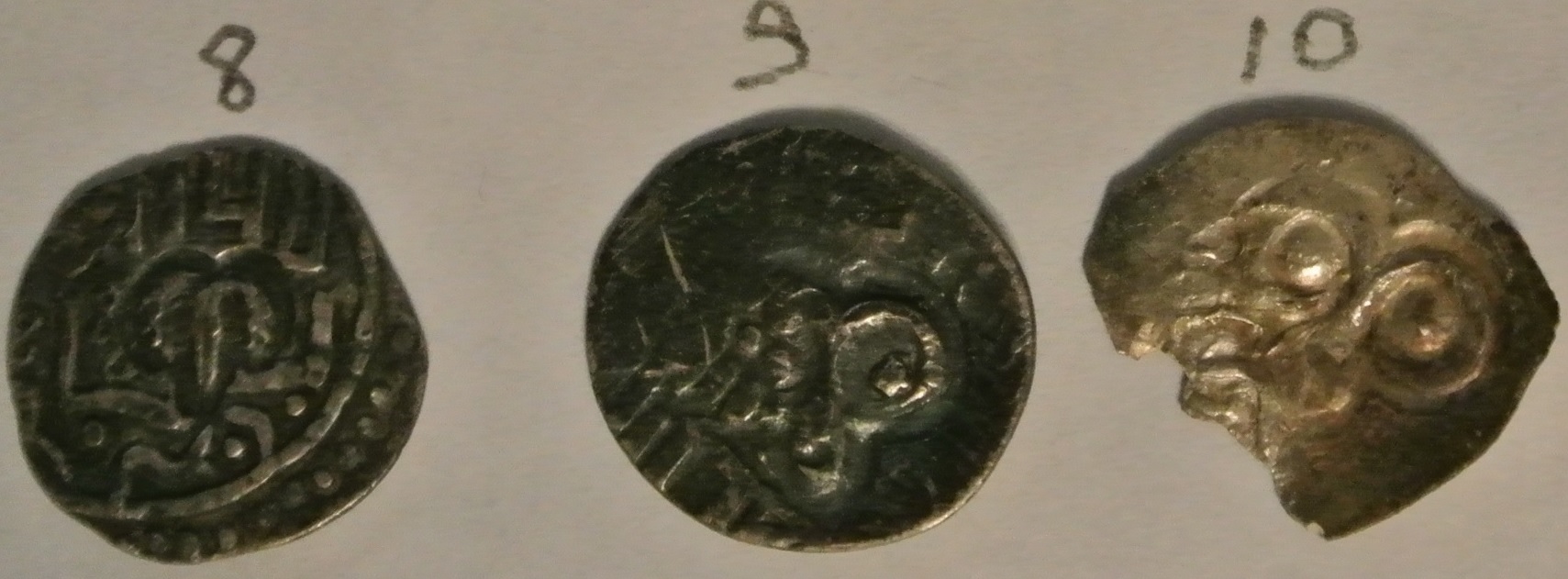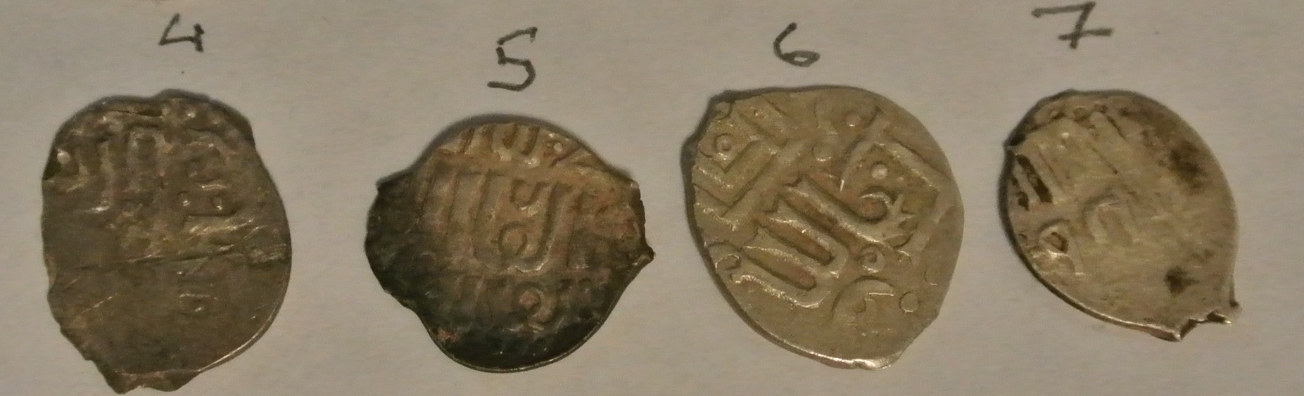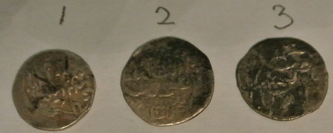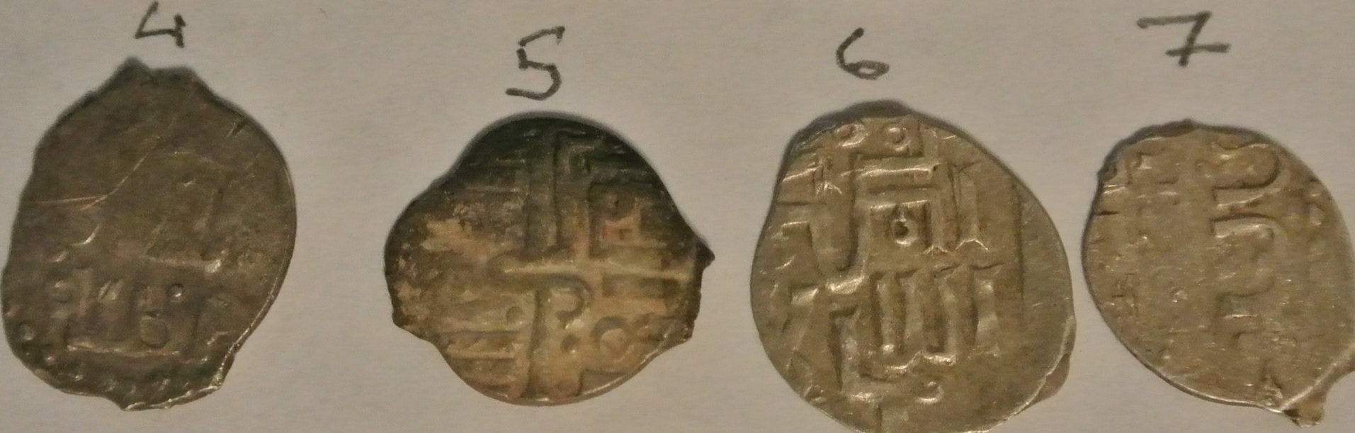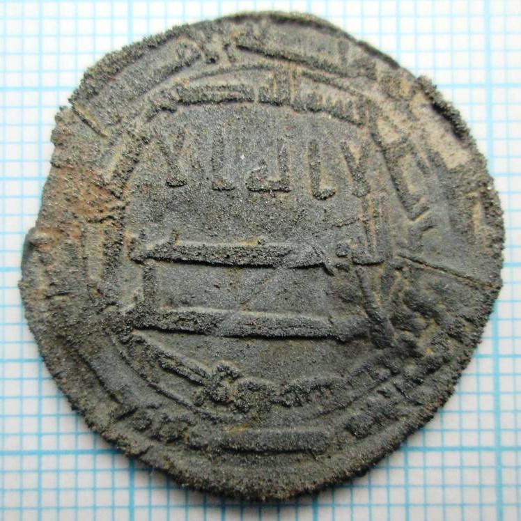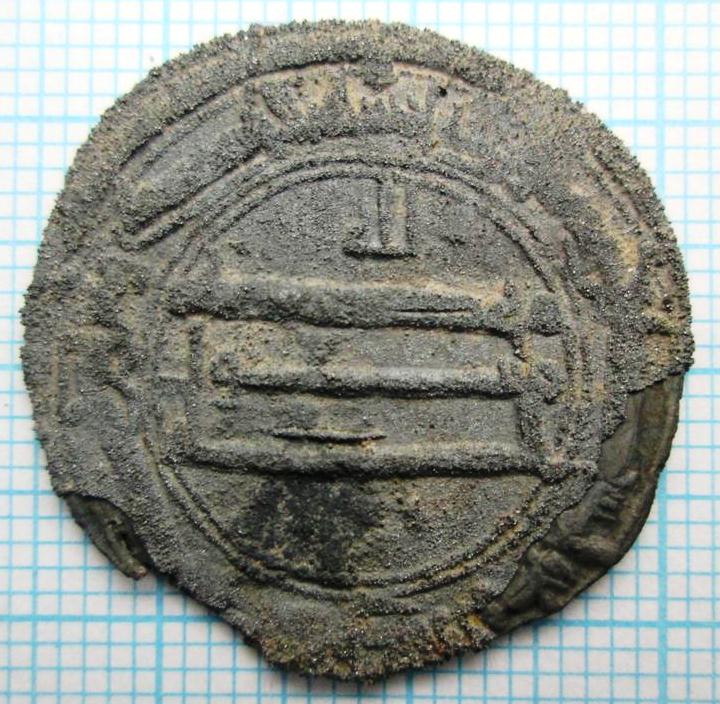 Добрый день,уважаемые коллеги. Помогите определить куфические дирхемы. Монеты из воды. Присутствует "роговуха". Весов к сожалению нет.
