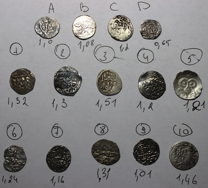 QUOTE(Б.Иосифович @ Nov 26 2015, 11:30) Комрады,прошу помочь в определении и оценке следующих монет.Заранее благодарен! Монеты 1 - 5 по подлинности особых сомнений не вызывают по фото. 1. Османское акче султана Мурада I (763-791 гг.х.) 2. Джиталы. Возможно - ранний Делийский султанат. 3. С атрибуцией ниже - согласен, номинал - драхма, похоже. 4. Индийская каршапана. Маурья, наверное. Сообщение отредактировано Скворцов: Nov 26 2015, 11:29 -------------------- Специализация: джучидские данги от Тюляка до Ибака.