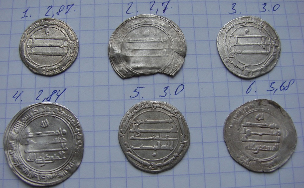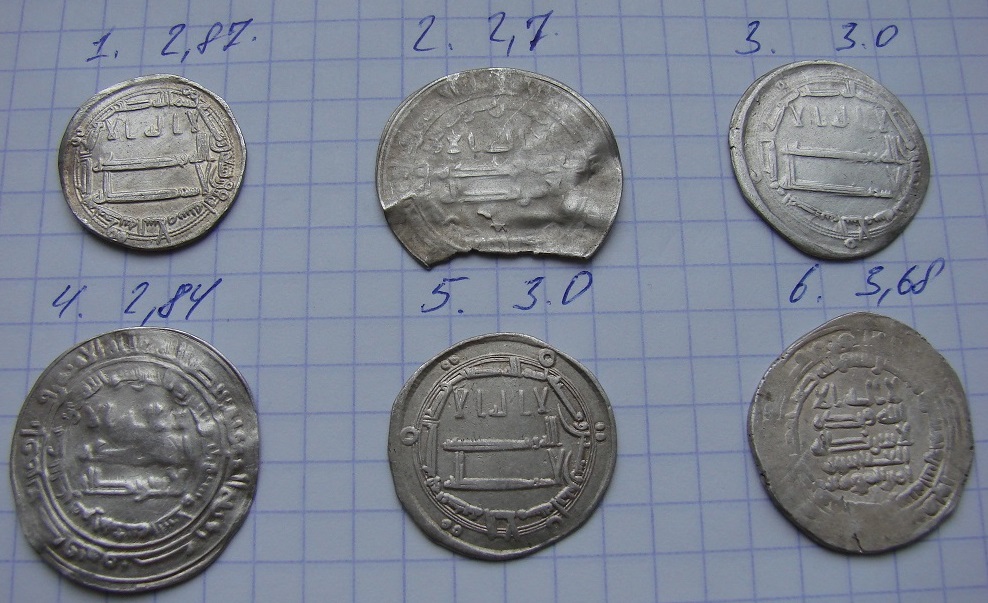 QUOTE(Агоь @ Feb 22 2016, 09:10) Всем доброго дня. Помогите пожалуйста с определением и оценкой. 1. Аббасиды, время ар-Рашида, м.д. Мадинат ас-Салам 192 г.х. Ок. 1000р. 2. Никаких выпускных надписей не видно. 3. Аббасиды, время ар-Рашида, м.д. Мадинат ас-Салам 188 г.х. Ок. 700р. 4. Аббасиды, ал-Мутеваккиль, м.д. Мадинат ас-Салам 233 г.х. От 1000р. 5. Аббасиды, ал-Махди, м.д. Мадинат ас-Салам 162 г.х. От 1000р. 6. Аббасиды, ал-Мустаин, двор не видно, возможно аш-Шаш, 252 г.х..Год необычный - этот халиф правил с 248 по 251 гг.х. От 1000р. |