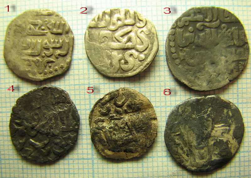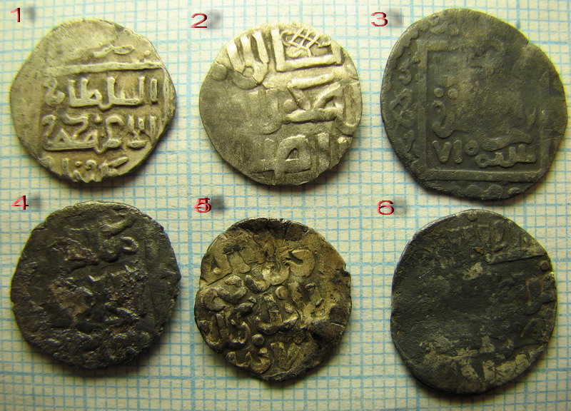 1) Узбек, чекан Сарая, (734 г.х.?). 2) ? (подрожание ?) 3) и 6) Токта, чекан Сарая, 710 г.х.. 4) Джанибек, чекан Сарая ал-Джадид, (год ?) 5) Узбек, чекан Азака, 739 г.х. (ошибка в дате, год задом-наперед: 937). |