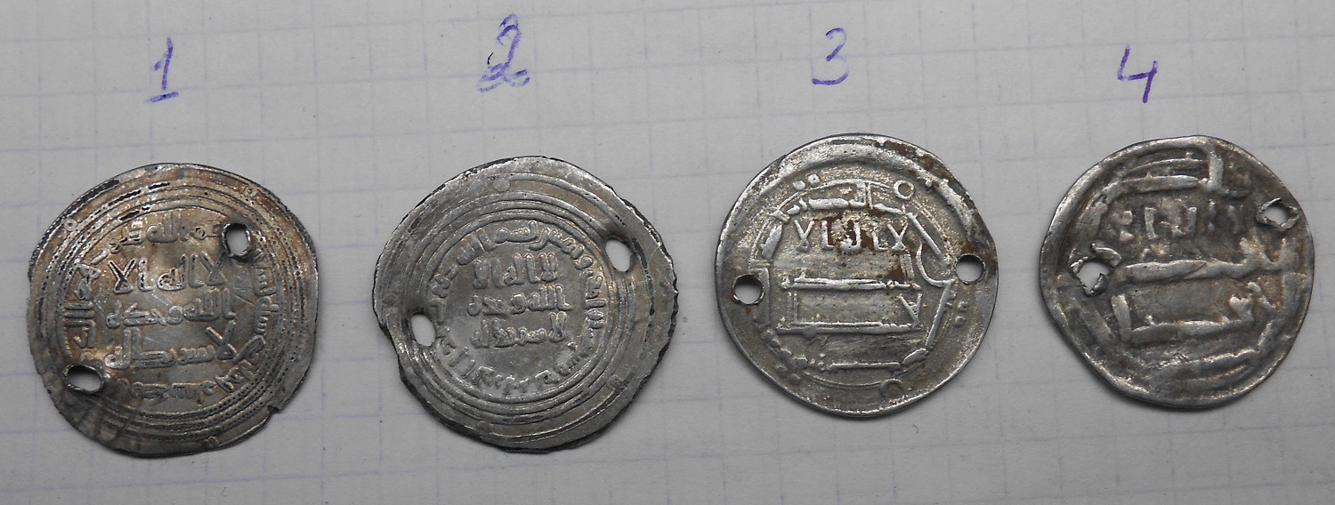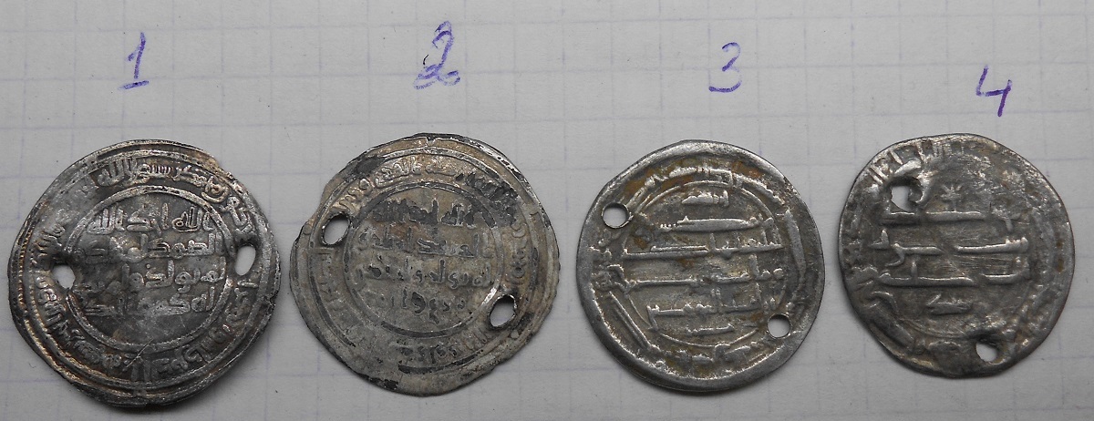 QUOTE(Сейри @ Apr 4 2017, 20:51) Здравствуйте. Помогите определить и оценить дирхемы. Заранее спасибо. 1. Омейяды, Ардашир Хурра 90 г.х. 2. Омейяды, Дамаск 81 г.х. 3. Аббасиды, ал-Хади (169-170/785-786), с им. наследника Харуна, ал-Харуния 170 г.х. 4. Аббасиды, дирхем североафриканской чеакнки. |