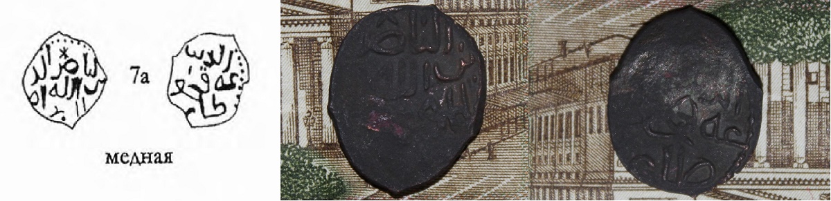 Монета медная с именем Ан-Насир ад-Дин Аллах. Без обозначения места и года чеканки. Предположительно 13 век, ранний Булгар. Представлена в каталоге монет в книге А.З. Сингатуллиной "Джучидские монеты поволжских городов XIII века под № "7а"." Заранее благодарен. Вложенные эскизы изображений |