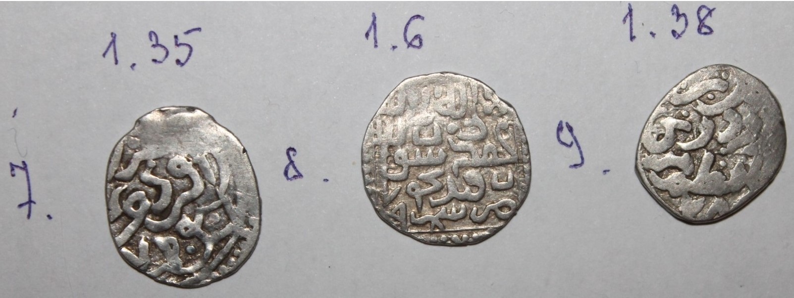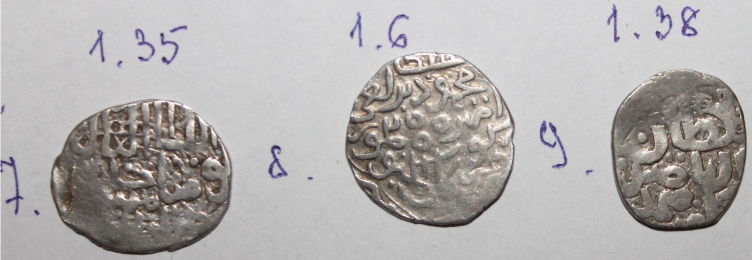 QUOTE(чук и гек @ Aug 9 2017, 11:20) Здравствуйте, уважаемые. Прошу Вас определить и по возможности оценить данные монетки. 1. Монета из сетки азакских дангов Тимур-Кутлуга. От 5 уе. 2. Токтамыш. Крым. Тип 796 г.х., до 5 уе. 3. Токтамыш. Орду. От 5 уе пробуйте. -------------------- Специализация: джучидские данги от Тюляка до Ибака.