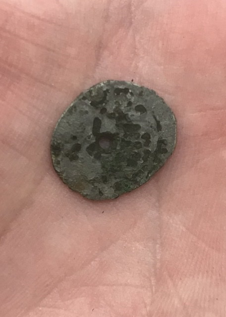 Здравствуйте!обращаюсь за помощью в опознании и оценке монеты, мне показалось что дирхем,особо не разбираюсь,не судите строго. Материал,на мой взгляд,серебро. Место обретения:Юг МО,вес узнать не могу,но показалось толще чешуи Грозного раза в полтора больше,не ясно и назначение отверстия в центре. Заранее большое спасибо