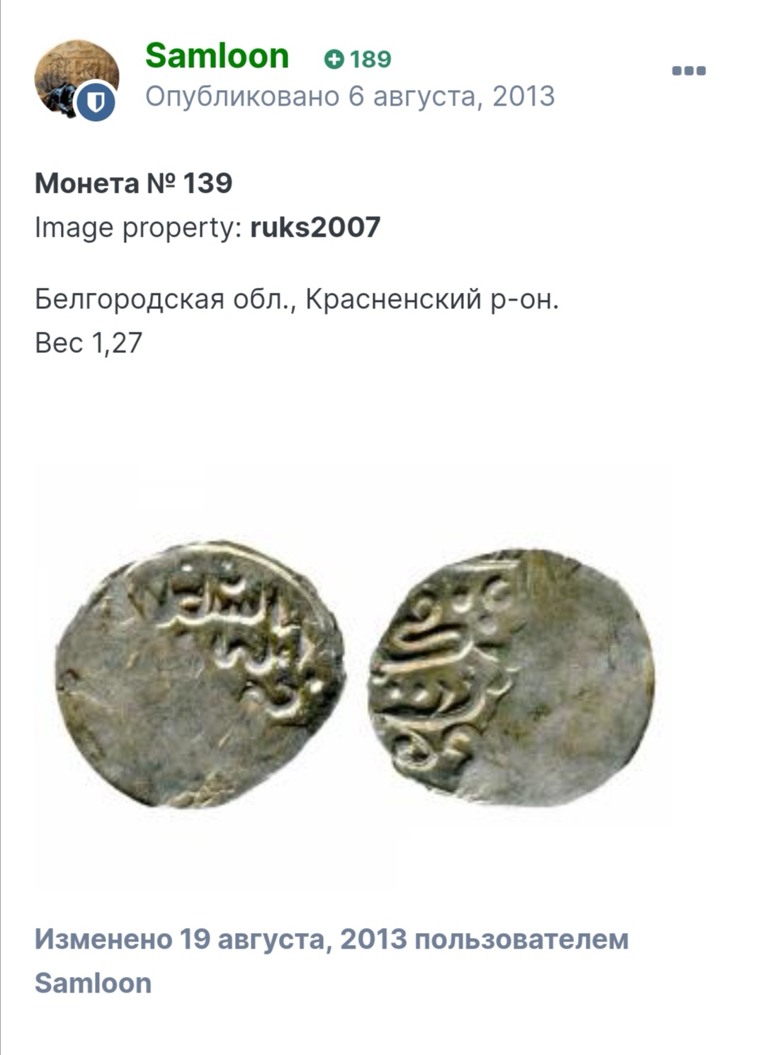 QUOTE(faustaz @ Jan 24 2021, 04:09) Всем доброго времени суток. Уважаемые знатоки помогите с атрибуцией 55 дангов. По надобности предоставлю отдельные фото и вес монет, для которых это потребуется. Заранее благодарен. ![]() ![]() Нашёл Вашу неопознайку в галерее подражаний. В 2013 м монетка то засветилась. А все благодаря Юрию Валентиновичу. Не его бы ветка, шыш бы мы узнали. Ну что, Яголдаева тьма? Сообщение отредактировано Разбой: Jan 27 2021, 15:27 Вложенные эскизы изображений -------------------- СаД - Сарай аль Джадид