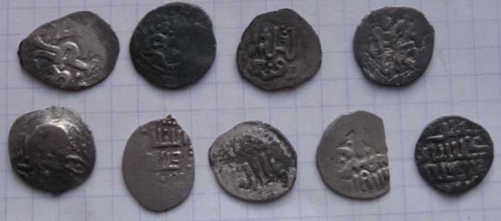 1. подражание 2. Тохтамыш, Азак, 78х 3. Тохтамыш, Орда, Власть Богу без даты 4. ? 2 ряд 1. подражание, ранний надчекан 2. подражание 3. подражание 4. подражание 5. Джанибек, Гюлистан, 756 |