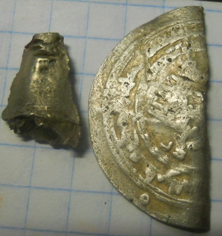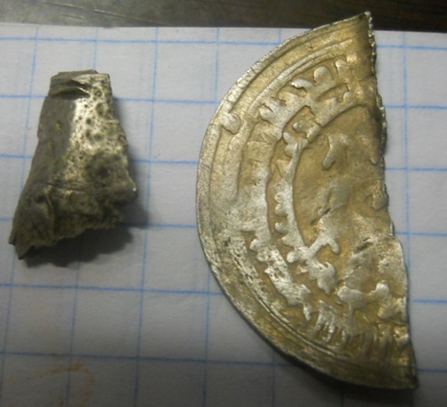 Спасибо за помощь. Место находки Южное Подмосковье,а по обрезанному кусочку нет не каких мыслей? Вроде серебро,может кусочек гривны.