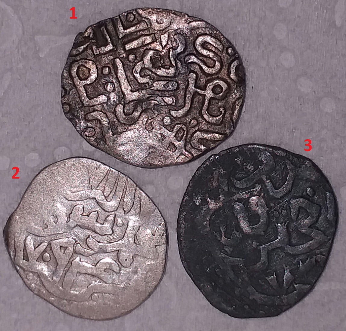 QUOTE(POMAH @ May 5 2022, 23:57) Здравствуйте ! Помогите пожалуйста с определением и оценкой . Заранее благодарен! вес: 1монета- 1.23 гр. 2 монета- 1.15 гр. 3 монета-1.26 гр. 1. Подражание. Регион назвать затруднюсь. Не нашел среди опубликованных сеток... 2. Токтамыш Крым 794 гх. Калима на реверсе. До 700 руб. 3. Токтамыш Хаджи Тархан 789 гх. От 1000 р. -------------------- СаД - Сарай аль Джадид