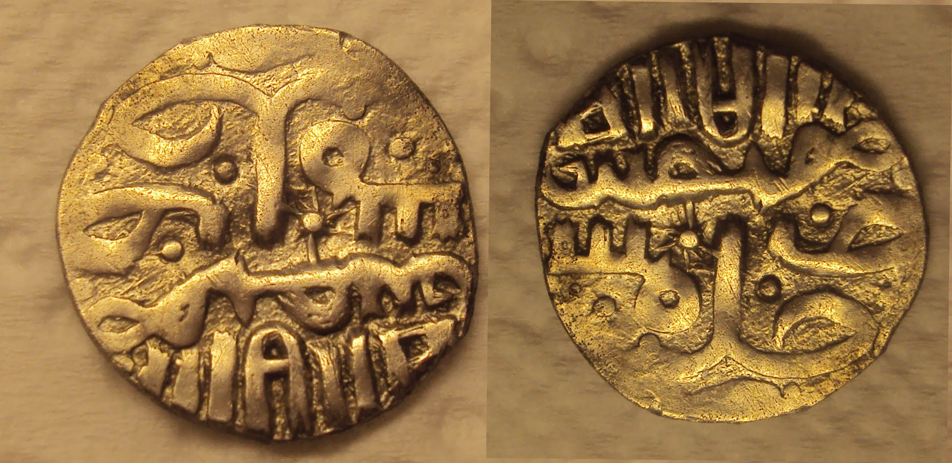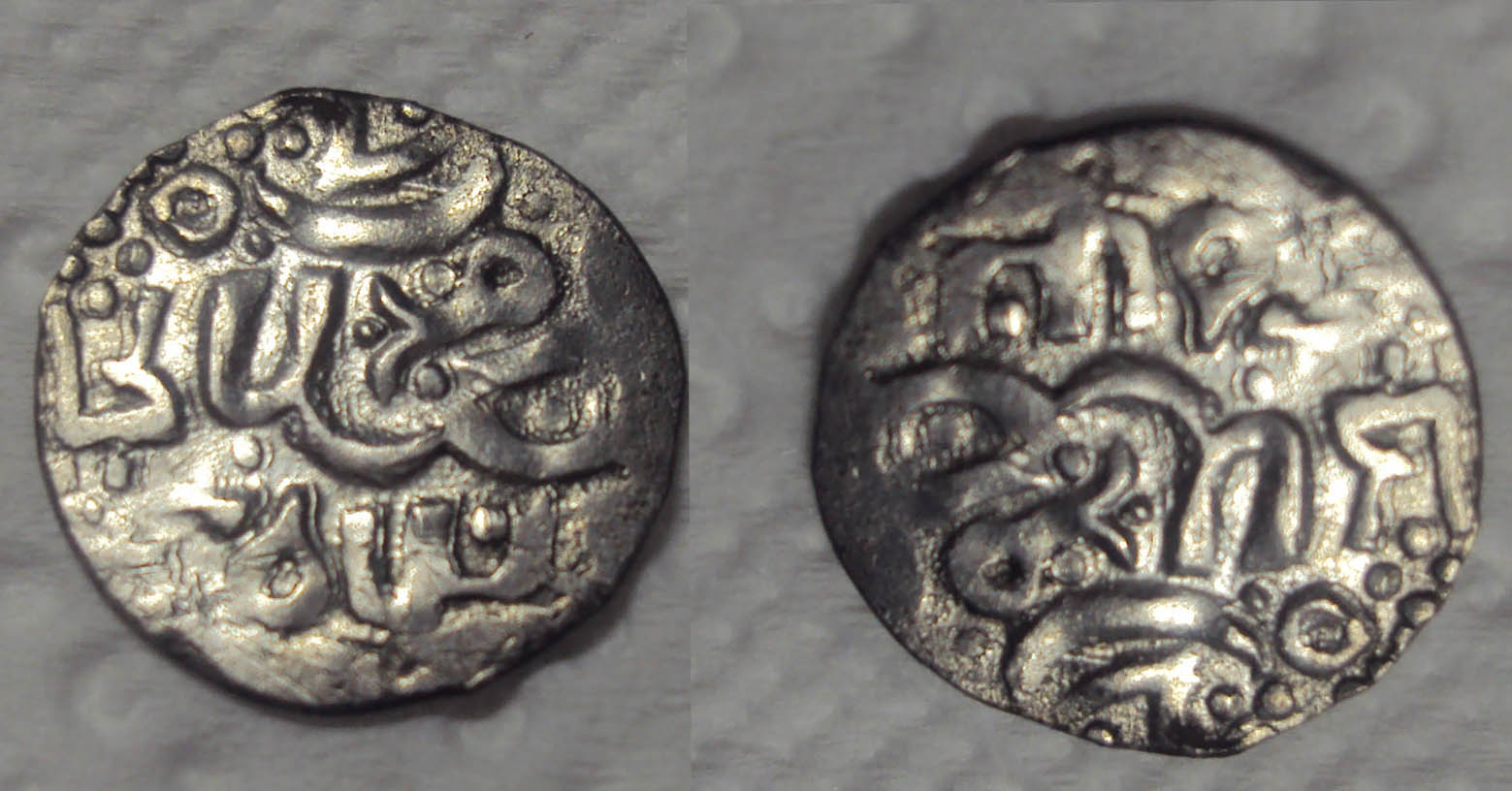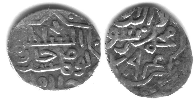 Второй - действителтно Бек-Кмбал. Первая монета - лицевик из большой, очень распространенной группы штемпелей с именем уйгурским письмом и несколько редуцированной легендой. Родина этой группы - Нижняя Волга. Оборотки обычно более классичные, с решеткой из 2-х овалов между слогами слова Джадид. Это - не особо удвчная попытка изобразить штемпель с началом слова Джадид в той же строке, что и слово Сарай, либо поптытка выдумать собственную компоновку. Читается (с искажениями) "Дуриба фи / Сараи [а]л-Джад / ид 5", либо "Дуриба фи / Сараи [а]л-Джад / санат 5". Это региональный нижневолжский чекан. Т.е. подражание, но времен Токтамыша, собственно ордынское и вполне легитимное.