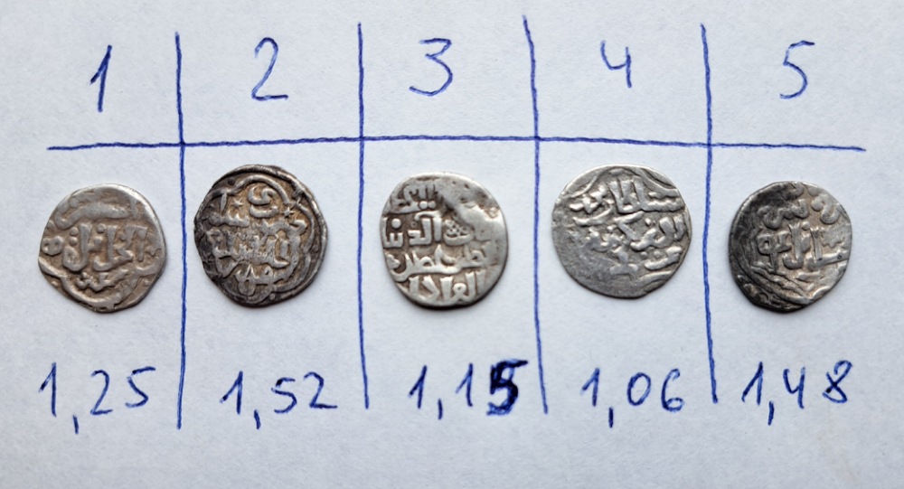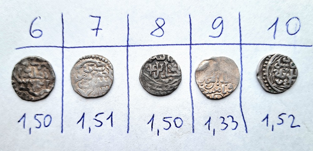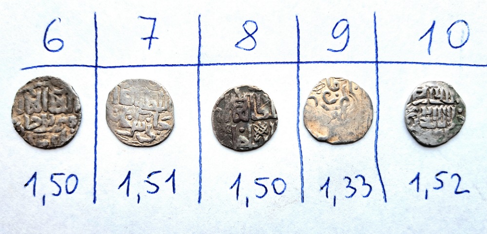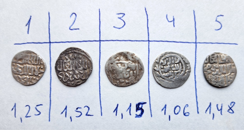 QUOTE(Trubadur @ Oct 8 2023, 15:31) Здравствуйте, помогите пожалуйста определить и оценить монетки. Заранее благодарен! С уважением. 1 Джанибек СаД 745 гх до 400р 2 Бердибек СаД 759 гх до 400р 3 Токта Сарай аль Махруса тип 710гх усеченный до 150р. 4 Узбек Крым тип 720 гх. В довольно приличном для данного типа состоянии. До 800р 5 Джанибек СаД 748 гх до 300р. -------------------- СаД - Сарай аль Джадид