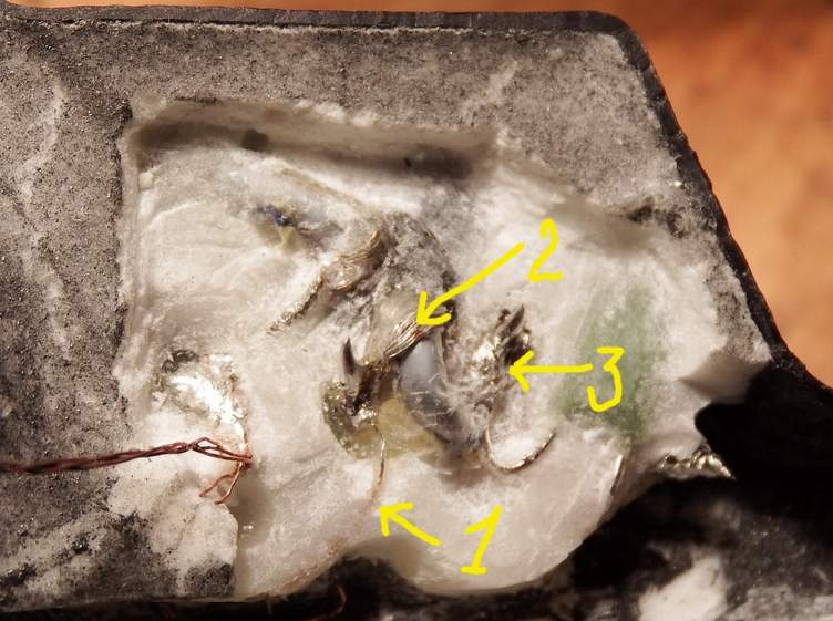 Сломали катушку. NEL HUNTER. Обмотка из тонкого провода лопнула. Пришлось её убрать. Всё делал аккуратно, но тем не менее возникла проблема. Не могу найти куда был припаян один из концов обмотки. Один из концов (его остаток под номером 1), припаян к оплётке кабеля( 2 ). К центральной жиле кабеля ( 3 ) припаян конденсатор. Остальное ковырять пока не стал. Я так понимаю, что никаких плат и микросхем там нет. Пара резисторов, пара кондёров. Я думаю, у Вас есть схема. Опубликуйте пожалуйста. Схему я где-то видел, может даже в начале этой темы, но давно, а теперь большинство рисунков не открываются.