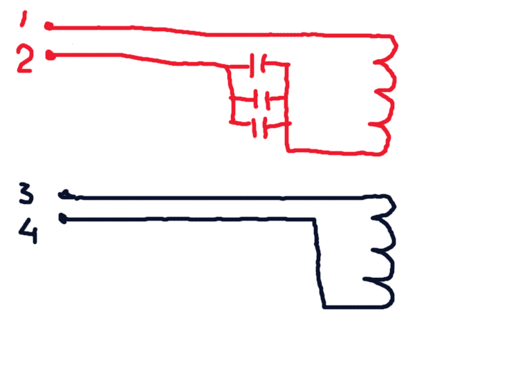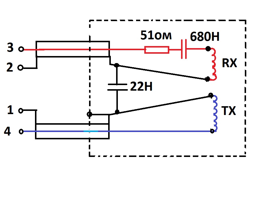 Поковырялся и вот что получилось. Вся катушка это две обмотки и три параллельно спаянных конденсатора. 1,2 на схеме это штырьки разъёма на кабеле. 1- земля, 2-центр. жила. Обмотка тонкого провода. 3,4-гнёзда- обмотка толстого провода. Сюда же сходятся провода экрана.