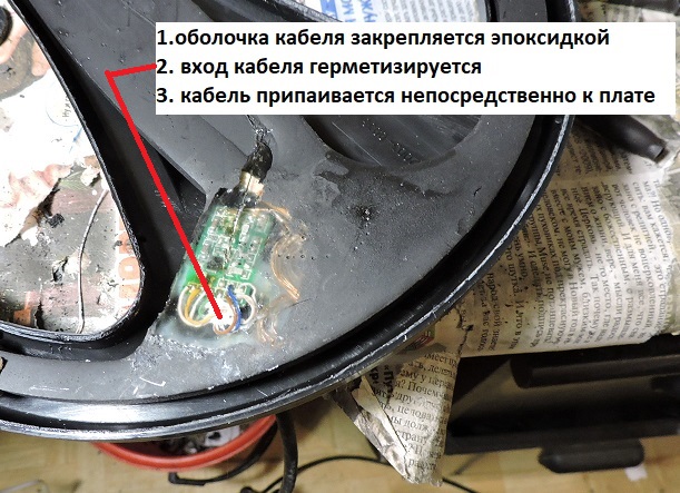 При ремонте катушек этой конструкции, все проводки, кабеля старого или своего нового я припаиваю непосредственно к плате. Заливаю место припайки кабеля эпоксидкой, как и было изначально. Но при этом вход кабеля закрываю герметиком, чтобы эпоксидка не пошла в кабель, и он не стал очень ломким (частый брак самого производителя катушек Минелаба, освещал и выкладывал фото в своих темах). Оболочка кабеля фиксируется эпоксидкой, и крепится в ней , а не только в гермовводе датчика. Восстанавливаю графитовый экран, ставлю новые уплотнители. Заклеиваю корпус дихлорэтаном. Проверяю и катушка готова. Заводские браки исключены, катушка лучше новой.... Так я делаю все катушки ДД10,5 дюймов сейчас, и так делал всегда.