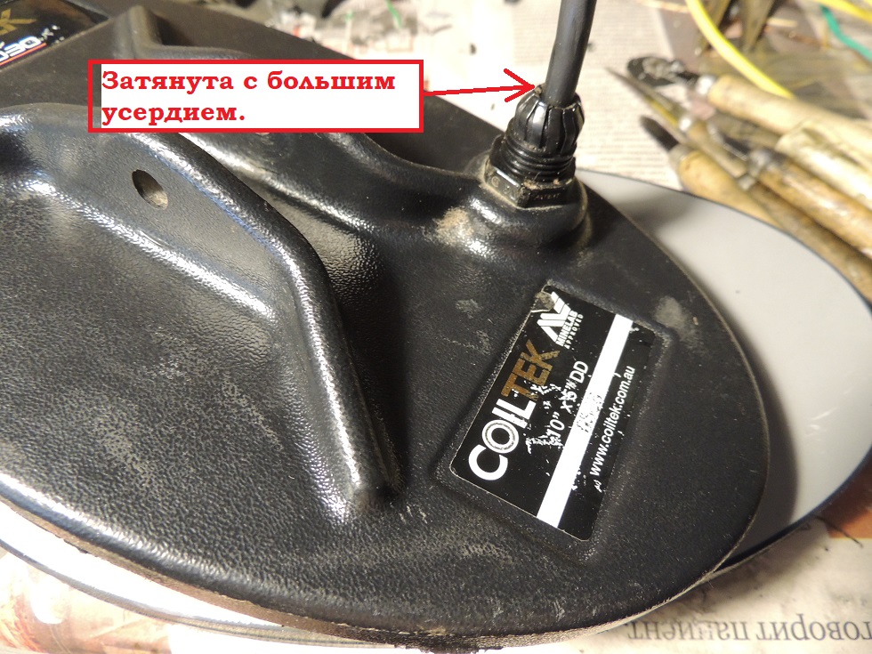 Хочу напомнить владельцам разных катушек. Что гермоввод, на котрый закручмивается хвостик закручен на заводе, так как надо. И лезть в него своими руками не надо. Так же не надо сувать туда разные герметики. И заматывать эту часть изолентой. Первое действие приводит к сильному пережиманию, от чего портится его внутренняя часть. От различных герметиков и изоленты портится облочка кабеля. Все это приводит к сокращению срока службы катушки и необходимости замены кабеля. Большинство катушек устроены так, что кабель входящий в катушку и далее залит эпоксидкой. И даже если убрать резинку из гермоввода, катушка будет герметична. На фото катушка от СТХ 3030 фирмы Коилтек. Которая пришла в ремонт. Еле гайку открутил. Была очень сильно зажата, в результате чего, кабель испортился внутри.