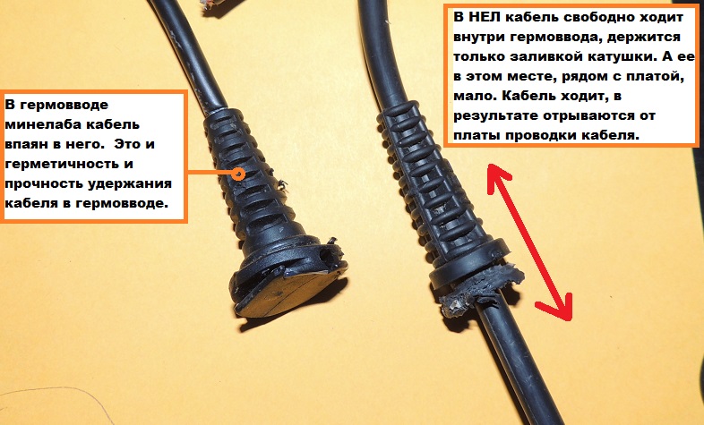 То о чем я пмсал, надеюсь будет понятно из картинки, котрую я прикрепляю. В минелабах кабель и гермоввод сделан за одно. И изготавливается таким образом, сразу вместе. На НЕЛах кабель внутри гермоввода не держится, а ходит свободно. Он внутри гермоввода не впаян и не вклеен. Сам гермоввод в корпус катушки вклеен, а вот кабель в гермовводе нет. Поэтому пыль, и вода свободно входят в гермоввод и уираются в заливку. А этой заливки, котрая есть эпоксидка с наполнителем в этом месте мало.... Потому предполагаю, это есть путь попадания влаги на плату, если эта катушка для Х-Терра.