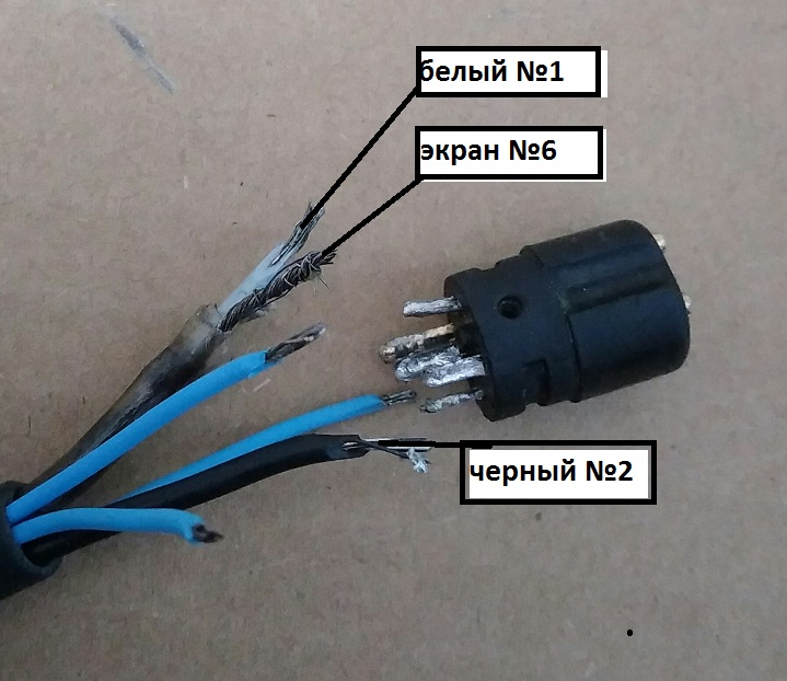 Распаять разъем можно и несложно. На фото распайка провода в экране. Там без вариантов, экран на 6 контакт. Белый провод на 1 контакт. Черный провод со стальным проводом скорее всего на контакт номер 2. Между экраном и этим черным проводом должно быть сопротивление 14...16 кОм. Затем ищите синий провод у которого сопротивление между ним и экраном 2 или 4 МОм. Его на третий контакт. Остальные синие на 4 и 5 контакт без разницы. Если при включении окажется на монету двойной сигнал, то 4 и 5 контакт, проводки поменять местами.