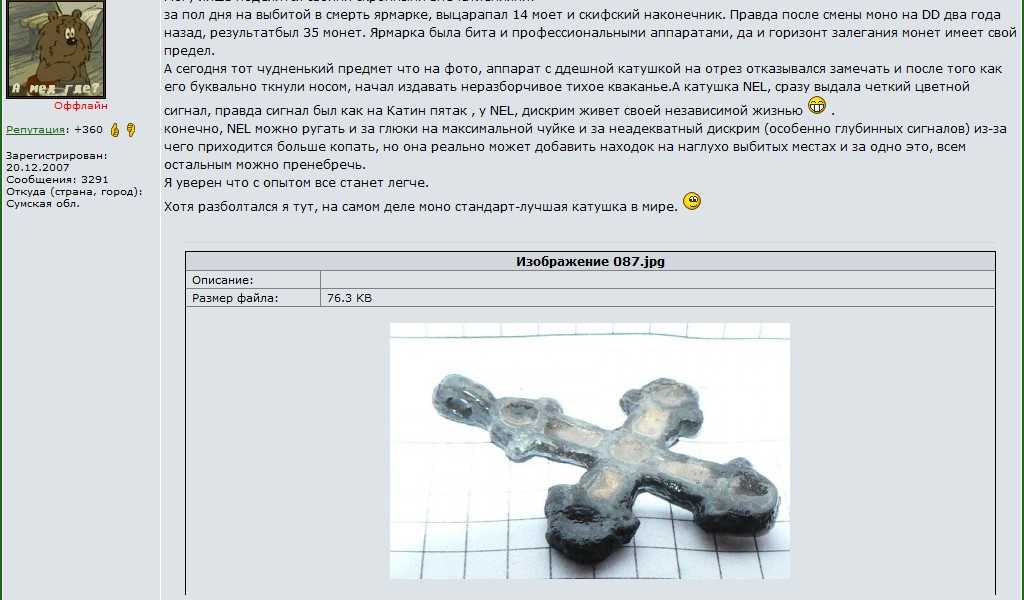QUOTE(V.Strelok @ Jul 23 2011, 13:30) Добавлю отзывы с украинского форума: Крестик , что на фото, точная копия моей первой находки катушкой НЕЛ. |