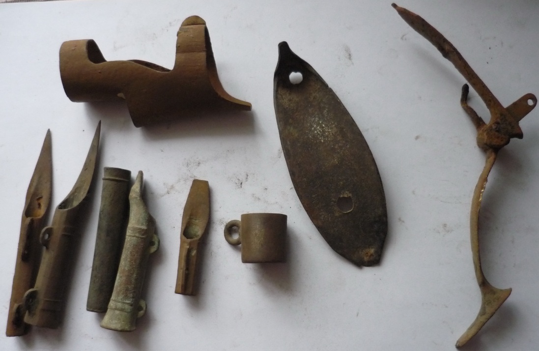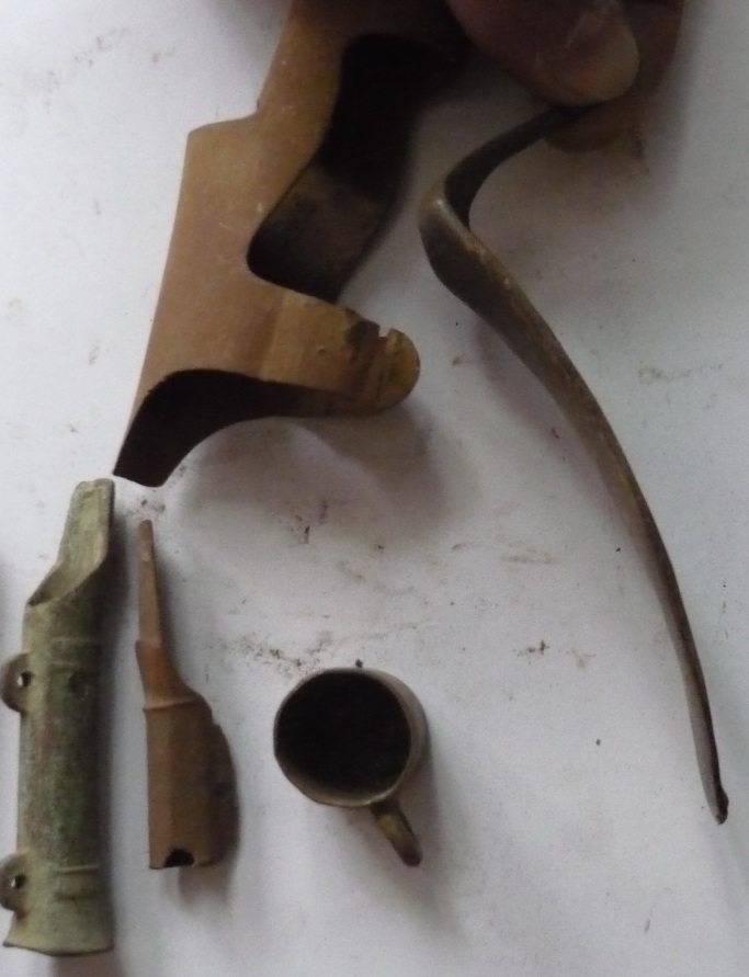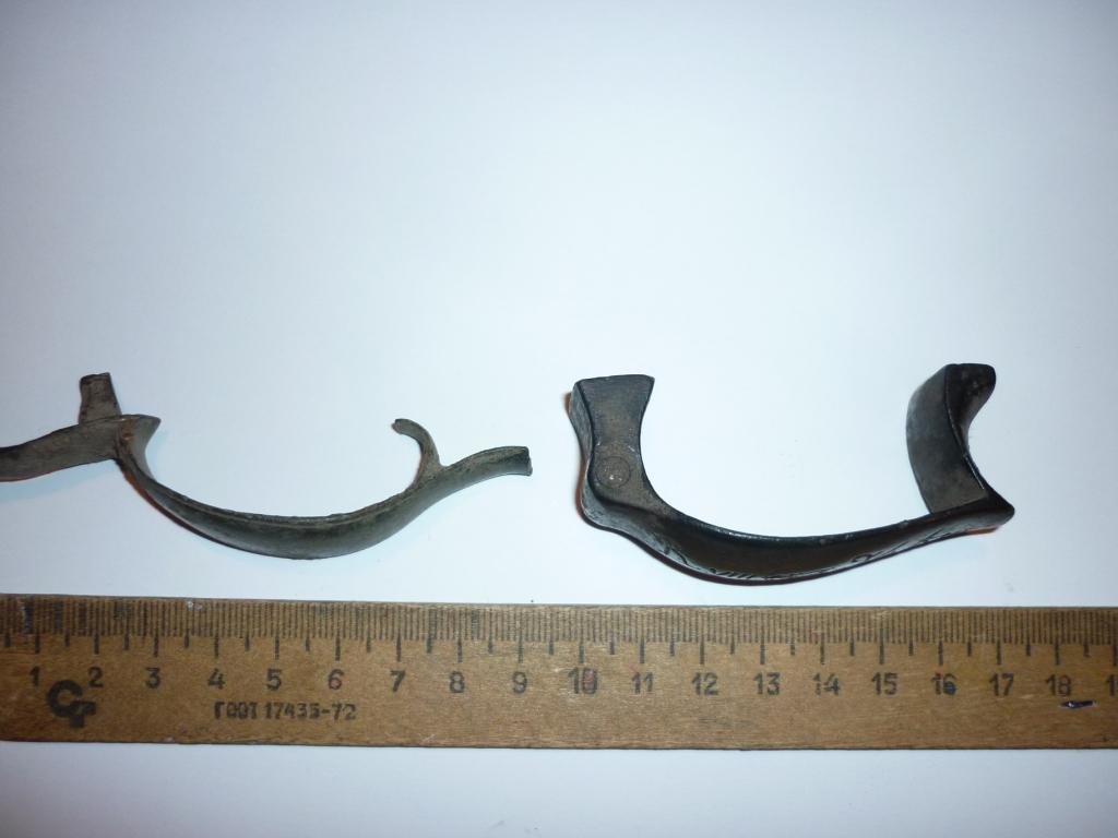 QUOTE(Вован Сидырыч @ May 23 2011, 21:59) Две скобы,правая, я думаю пистолетная, а вот левая от чего? Не времен ли крымской войны вражеская запчасть? 1)Возможно от пистолета, может и от ружья, разлет, с начала и до конца 18-го века. 2) скоба, видимо от штуцера(нарезного военного ружья) конца 18-нач 19-го века, видимо не наша, таких, не встречал, территориально, находку где нашли, сопутка какая? -------------------- ИГРАЙ МОЙ ГАРМОНЬ!