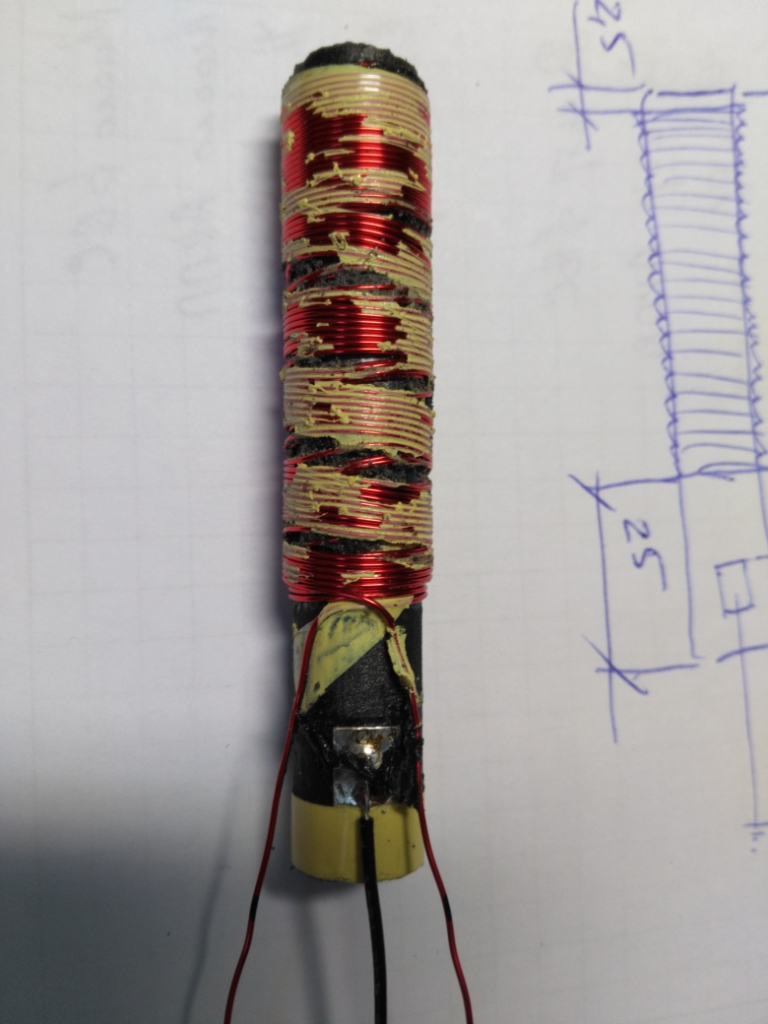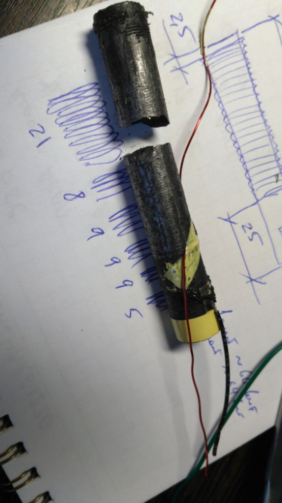 Решил начать с перестраховки - купил китайский Gold Hunter At, чтобы в случае неудачи не остаться без хобби. Потом, перечитав несколько раз форум, а именно тексты Василия, решил пилить. Скажу честно - было страшно. Переживал, что задену жизненно важные органы В результате запила катушка целая, можно было и больше оттяпать. Можно, но не нужно поскольку корус пина имеет гребень для снятия грунта и усеченный конус. Чем меньше отрежете, тем незаметней стык после восстановления будет. Опилки и куски пластика родного корпуса пина не выкинул, а растворил в дихлорэтане, получив таким образом, самый хороший клей совпадающий и по группе и по резус-фактору Далее самое тяжелое испытание - извлечь сердечник из корпуса. Сразу предостерегу: чтение мутоты на бескрайних просторах по типу "нагреть в кастрюльке и выбить" - не работает. Для выполнения этой операции, дополнительно к пониманию процесса, потребуются: пинпоинтер с отпаянной платой и спиленным носом. кувалда, деревянный чопик и стальные, нет, простите, титановые яйца. Последнее нужно чтобы со всей пролетарской ненавистью, не моргнув, точно в нужную точку, через чопик, ударить по сердечнику. Тогда он... немного сдвинется с места. Остальное больно вспоминать. Очевидным признаком того, что у вас все получилось, обычно, случается фуршет, с распитием алкогольных напитков. Ну и такая штука поутру Потом начинается непосредственный ремонт пинпоинтера. Первым делом зарисовываем, фотографируем многократно и считаем витки провода, которым намотан датчик. Без лишних стеснений, кто как умеет, зарисовываем, считаем. В итоге должно получиться примерно следующее |