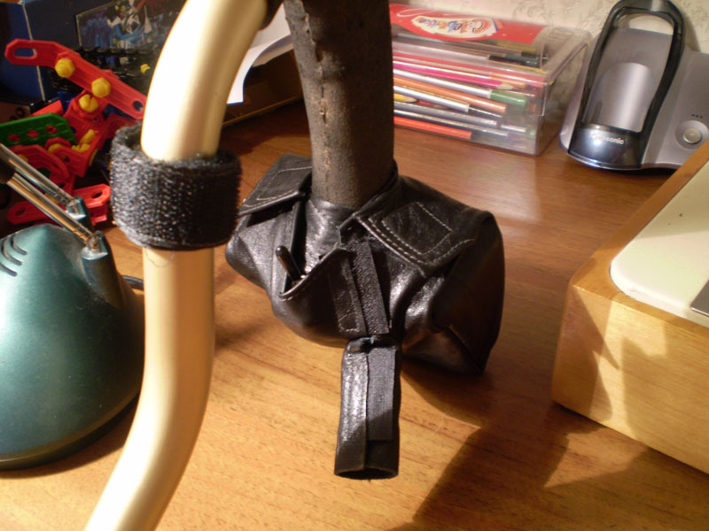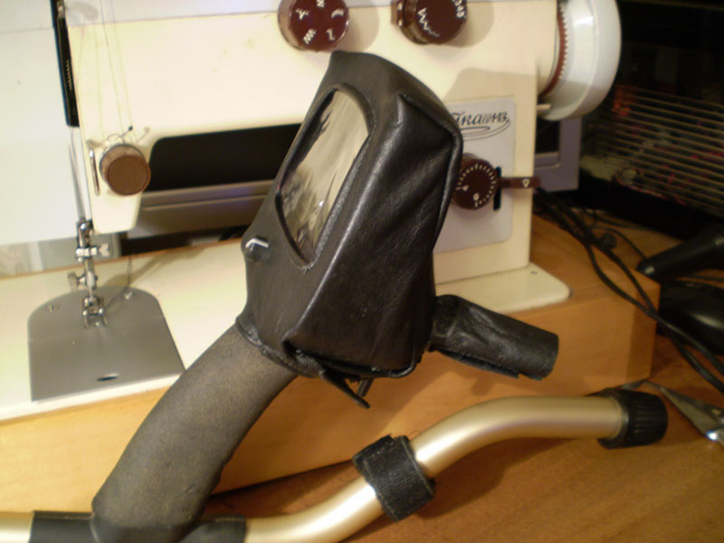 Тоже родные чехлы истрепались. Сделал себе кожанные. На блок управления ещё осенью, пару раз успел выехать с ним. А на батарейный блок - на новогодних праздниках. Немного неказисто, но своими руками-то надежней и микроскопические затраты (лоскуты от старой кожанной куртки и нитки лавсановые). Мудрить не стал, просто обвел шариковой ручкой по контурам родные чехлы, распоров их перед этим по швам. Открытые края загнул-прострочил. Окошко - всё тот-же материал от сумок для одеял и подушек. Крепление на родных липучках + добавил пару, где посчитал нужным. И всех делов.