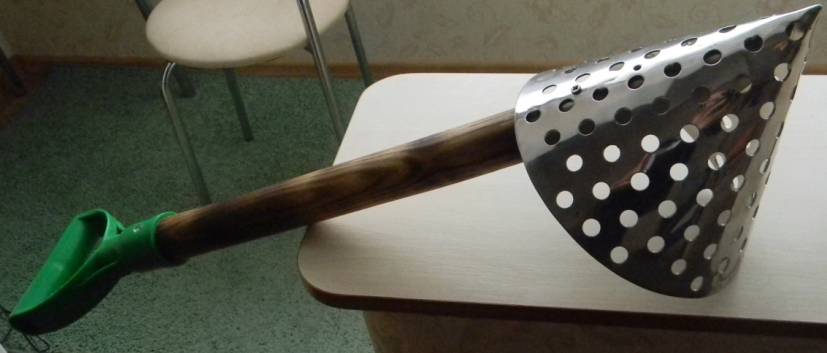 Да, конус - это не для рекордных глубин, фактически это удобная загребушка для целей на глубинах 15-20см, глубже нужен уже шестигранник или что-то подобное.... Ручка с изгибом дейстивтельно должна быть по идее еще удобнее да и в мутной воде ориентировать конус с такой ручкой наверное проще (положение не повторяется). А какова получилась общая высота конуса?, интересует величина древка. При наличии поперечной лопатной ручки древко можно сократить практически на 30-40%, держась за лопатную ручку можно примерно опереться на конус как дед на палочку