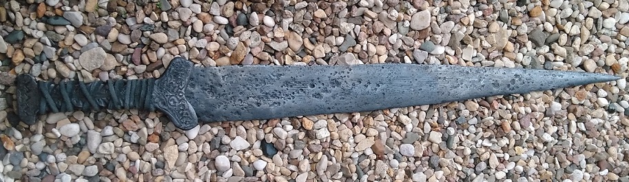 После расчистки клинка настало время создания рукояти. И тут уже в ход пошли шкурки,напильники,граверы,сварки и прочие болгарки.Так же изделие прошло щадящую термическую обработку и слегка приворонено для нивелирования разницы в цвете между металлами рукояти и клинка.После этого изделие стало выглядеть гармонично.Вот собственно результат...