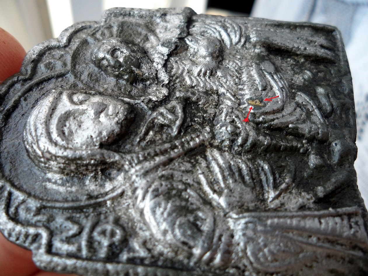 С химической точки зрения, со временем сплав может разделяться на составляющие, а составляющие могут диффундировать на поверхность. Цвет сплава, в зависимости от содержания олова в бронзе, может меняться с желтого до серого. Желтый-меньше олова, серый-больше. Из глубины иконы олово проступило к поверхности, внутри его стало меньше, сплав желый в царапине, зато поверхность обогащена оловом