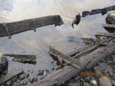Лето 2010 выдалось засушливым, вода на Волге ушла, и недалеко от берега вышли из-под воды останки затопленной баржи с деревянным корпусом. |