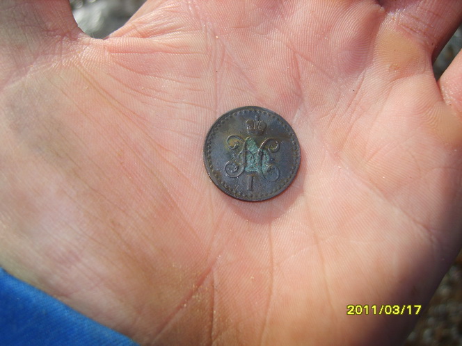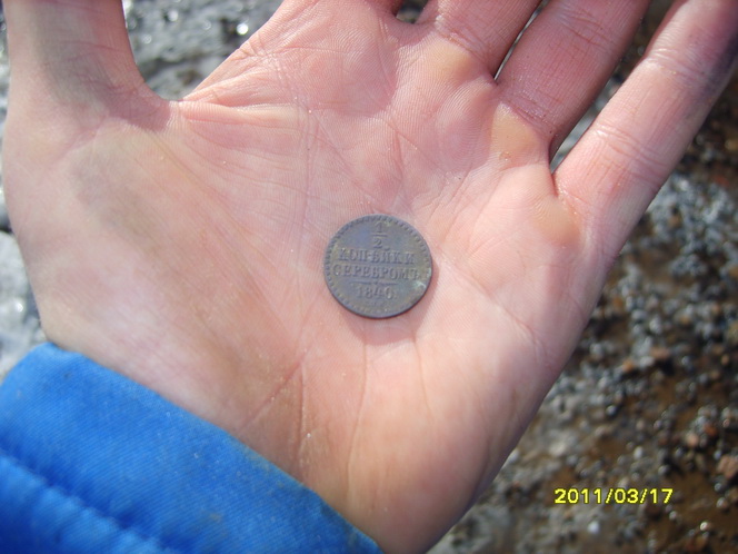 Довелось мне несколько лет назад, во время копа познакомиться с одной старушкой, местной жительницей, возраста почти векового. Заинтересовавшись, чего это я брожу по берегу реки с какой-то пищащей штукой, бабушка подошла, поболтали, и между делом она поведала мне одну историю. Во время оно, когда бабуля была еще махонькой девчонкой, стояла на берегу Волхова купальня. Детишки купались там каждое лето, и случилось так, что знакомая моей собеседницы потеряла во время купания золотой крест, по словам бабушки, «с мужскую ладонь». Я напрягся и постарался выведать у провокационной старушки месторасположение золотоносной купальни. Бабуля согласно кивнула и весьма подробно объяснила, где и что. Не помню, что помешало мне в тот год добраться до волшебного места, но следующей, же весной я был там. Монеты, крестики, колечки, но… никакого золотого креста. Год прошел, весна, монеты ( уже меньше), креста нет! И еще год, еще меньше находок, лунный пейзаж, нет креста!!! Сегодня, по традиции, снова вышел на Волхов, цапнул одну монетку, порадовался, конечно, однако где-то в глубине души живет надежда на ту самую находку… Золотой крест все еще ждет меня. А вот и сегодняшние фотки Вложенные эскизы изображений |