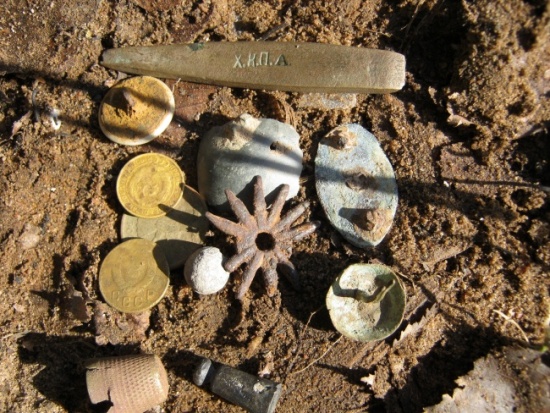 Снега еще прилично, но на возвышенных, открытых местах снег уже стаял и видна земля.. У меня за домом поле начинается. На нем холм есть. Всегда первым оттаивает. Каждую весну на этот холмик выхожу, Не для реального поиска, а просто помахать, так сказать, ломку снять. Раньше, говорят, там подсобное хозяйство было. На поверхности железного мусора нет, но в дерне и ниже много. Местами очень много. Постепенно, разными приборами, все явно звучащие цветом цели были выбраны, потом и сомнительные. В прошлом году с Т2 удалось выудить только одну конинку. Сегодня пошел Рейсер 2 там пробовать. Где мусора поменьше - тишина, ничего цветного не услышал. Может и правда уже весь цвет вытащил. Забрался тогда на самый замусоренный пятачок, метров шесть на шесть. Удавалось и раньше там кое-что вытягивать, но со временем и Прохор, и ГМП, и Т2 уже молчали. Хоть с какого направления заходи и маши - только железные сигналы, один за одним, пулемет. Уже думал, что только после удаления чернины (или хотя бы части её) возможно будет что-нибудь еще найти. Каково же было моё удивление, когда сегодня удалось выявить там несколько цветных целей. И дело не в их ценности, а в том, что на уже молчащем для предыдущих приборов месте Гонщик говорил " копай ". Где явно, где не очень, но именно - копай. Катушка была 5" снайперка. Искал на двух разных настройках.