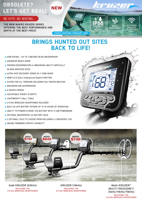 QUOTE(Strannik-m @ Jan 23 2018, 20:12) Makro Kruzer + Gold Kruzer + Multi Kruzer. 3 Новинки 2018.Водонепроницаемые. Погружение в воду до 5 метров. Монетный пылесос стал еще и подводником! ![]() ![]() Хорошая новость! Майнлаб наверно напрягся...Скорее всего буду брать мультиверсию, в этой ценовой категории у него конкурентов не просматривается. Нацелился было на Нокта Импакт, но теперь уже особого смысла брать ее нет, если только подводный вариант, а когда он выйдет-не понятно. Надеюсь Рустем сделает соответствующий анонс у себя в темах. Сообщение отредактировано CoDMan: Jan 24 2018, 08:57 |