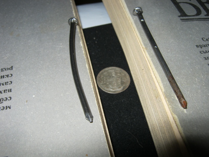 А Вы не могли бы испытать прибор с таким расположением целей, как на фото. Два гвоздя по 6 см. Гвозди лежат на книгах. Между гвоздями 3 см. Внизу монетка небольшая (например, билон 10 копеек, хоть царский, хоть советский). Начать с небольшой высоты, ну хотя бы с одного сантиметра. Постепенно меняя толщину книг, тем самым поднимая гвозди. На каком расстоянии от монеты до гвоздей прибор сможет озвучить её. Проводка катушкой не медленная, а как при ходовом поиске. Чтобы катушка в левом-правом положениях полностью покидала цели.