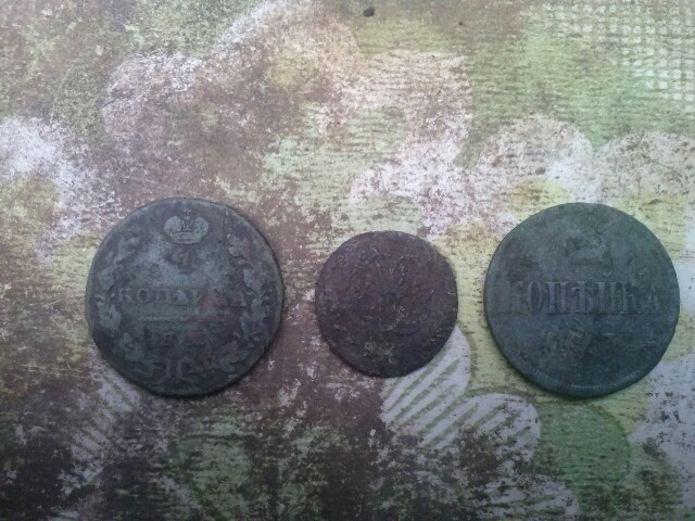 Здравствуйте, сегодня у меня своеобразный рекорд по монетам, три штуки, копейка 1829 года, копейка 1863, и полушка Елизаветы петровны, год пока не знаю, вообщето были ещё три кругляша из одной ямки, но их считать не будем, полтинники современные, но гады с глубины, заставили поволноватся, настройки старые, д2 на 9, сенс на красной черте, грунт на 7 часов, на д 1 ставил, но поползли кованные гвозди, некогда их копать, много попадается пробок с приличной глубины, я к этому не привык, скажу честно, не жалею, что купил Адвентис.