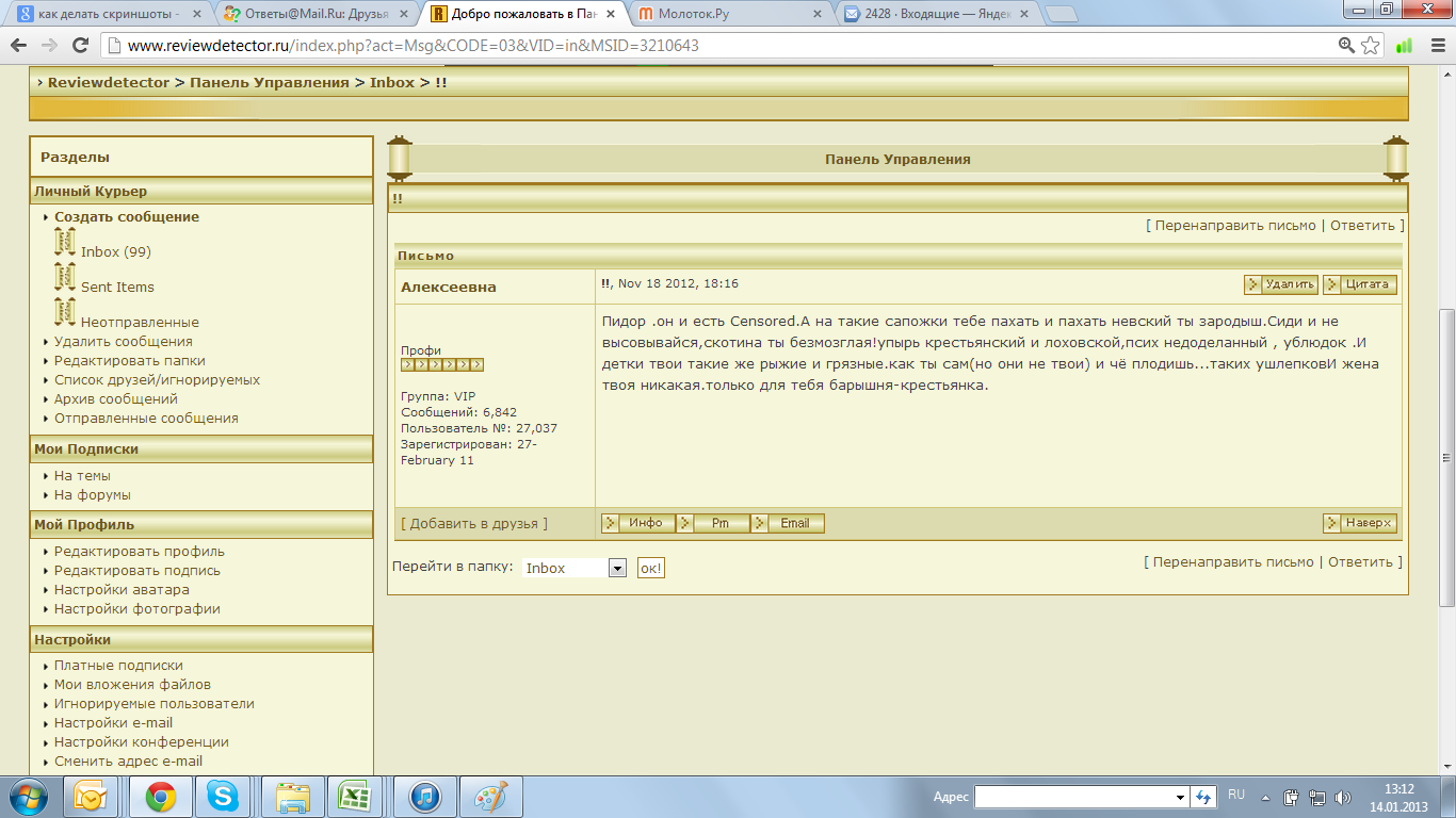 QUOTE(super.veter @ Jan 14 2013, 13:37) А че вы паритесь. Побоку, нехай тешатся горемыки. Олег, мне тоже в личку пишут...Хорошие, интересные письма. И неадекватные письма есть, их немного...Но они есть. Но как на такое отвечать? Вопрос ко всем...До сих пор не научилась, всегда бываю в растерянности от хамства в личке... Как на такое реагировать? Поделитесь опытом, кто таковОй имеет. -------------------- дайте мне цель, и я переверну землю...на штык.